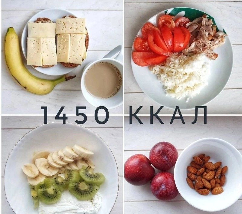 ✅Меню на 1450 кКалорий ❤️ ⠀ ✅Завтрак Бутерброд с маслом и сыром Хлеб 2 кусочка (~80 г) Масло сливочное 82,5% 10 г Сыр лёгкий 30 г Банан 100 г Кофе с молоком ✅Перекус Слива (или другой фрукт) 180г Мин