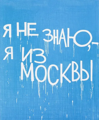 «Я не знаю, я из Москвы» Валерия Чтака на торгах ВЕСНА 100% Если первый вариант был строго монохромным, то здесь Чтак впервые выбирает мягкий цветной фон: светло-фиолетовый, розовый, голубой. Фраза т
