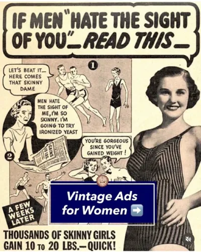 Реклама для женщин по НАБОРУ ВЕСА каких-то там годов Перевод: Если мужчинам не нравится ваш внешний вид, прочитайте это 1. Сваливаем, а то сюда идет эта худощавая 2. Мужчинам не нравится мой вн