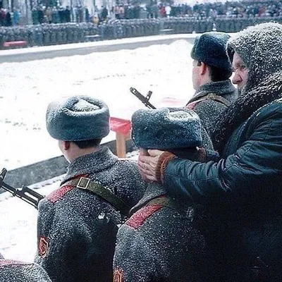 Бабушка греет уши своему внуку во время принятия им военной присяги. Волгоград 1994 г.