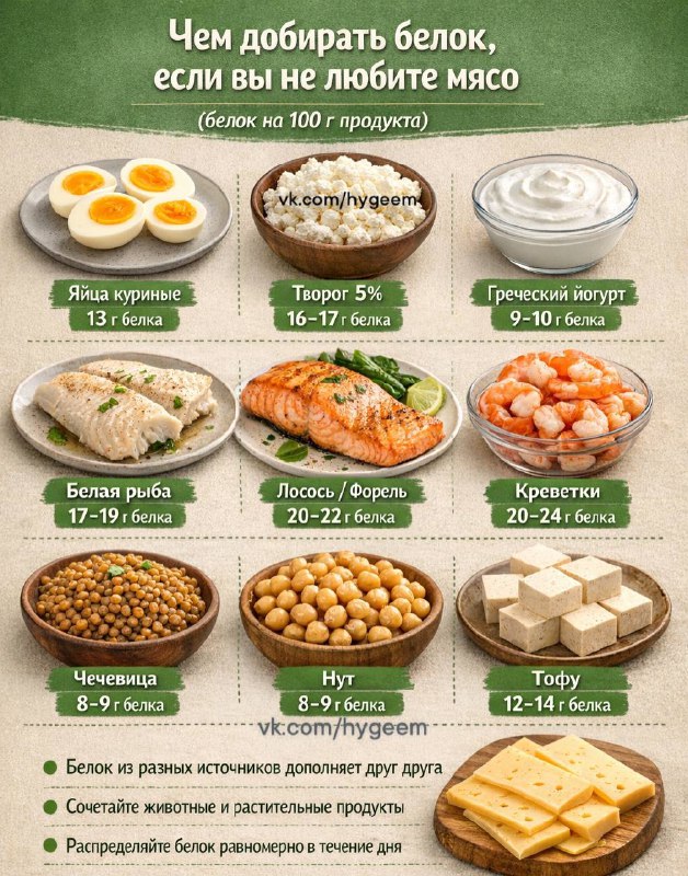 ✅ Как добирать белок, если вы не любите мясо 🔸Если мясо не заходит — это совершенно нормально. Белок можно легко и вкусно добирать из других продуктов, без насилия над собой и без перекосов в рацион