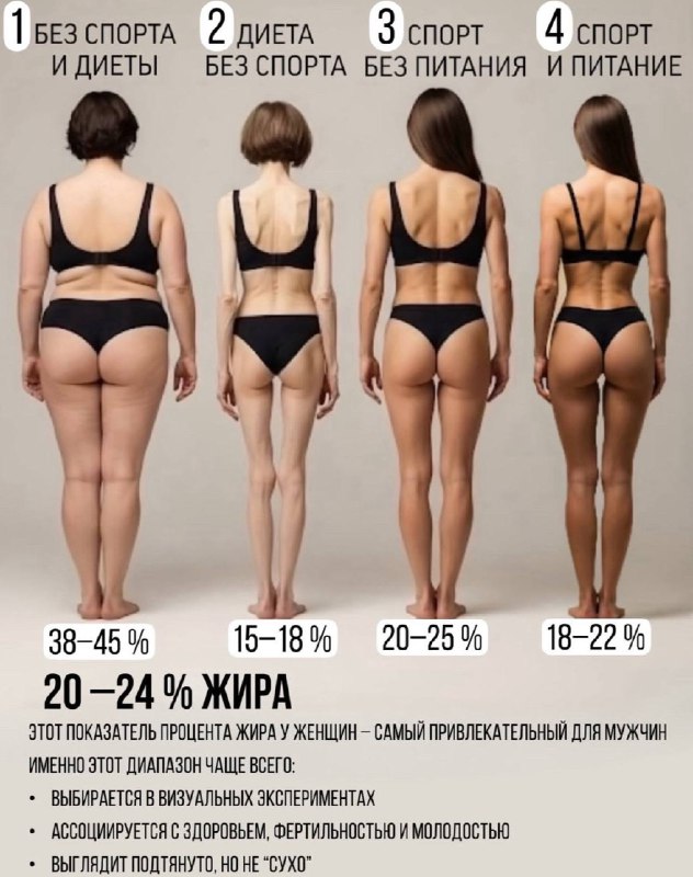 ✅Процент жира у женщин: почему важно искать «свой» диапазон, а не идеал из картинок На фото - четыре разных состояния тела при разном образе жизни. Они наглядно показывают: дело не в весе, а в состав