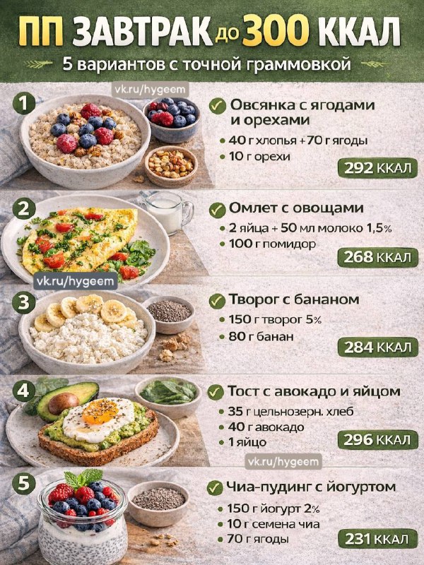 ✅ ПП завтрак до 300 ккал - 5 вариантов с точной граммовкой 🔸Подойдут для нормы 1300 - 1600 ккал. Сытно, просто, без сложных продуктов. 1️⃣ Овсянка с ягодами и орехами ▪️ Овсяные хлопья сухие - 40