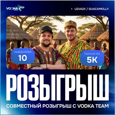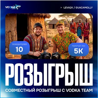 АФРИКА ВАЙБ от GUACAMOLLY и leva2k 👍 10 победителей получат по 5000 рублей 💸 Условия: • Быть подписчиком leva2k, GUACAMOLLY и VODKA TEAM • Поставить ❤️ на данную запись • Нажми на кнопку «Участв