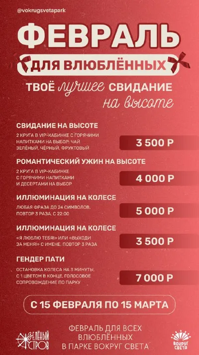 💓 Хотите устроить незабываемое свидание или просто приятно провести вечер? Наши VIP-кабинки на колесе обозрения созданы для особых моментов! Ужин при свечах, ваш любимый человек рядом, и потрясающи