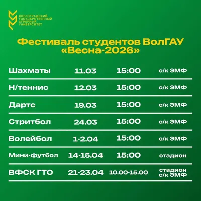 💪⚽️На старт, внимание, марш! Уже сегодня стартует фестиваль студентов ВолГАУ «Весна-2026». Соревнования пройдут в рамках Всероссийского проекта «УНИВЕРЛИГА» ОМОО «Ассоциация студенческих спортивных