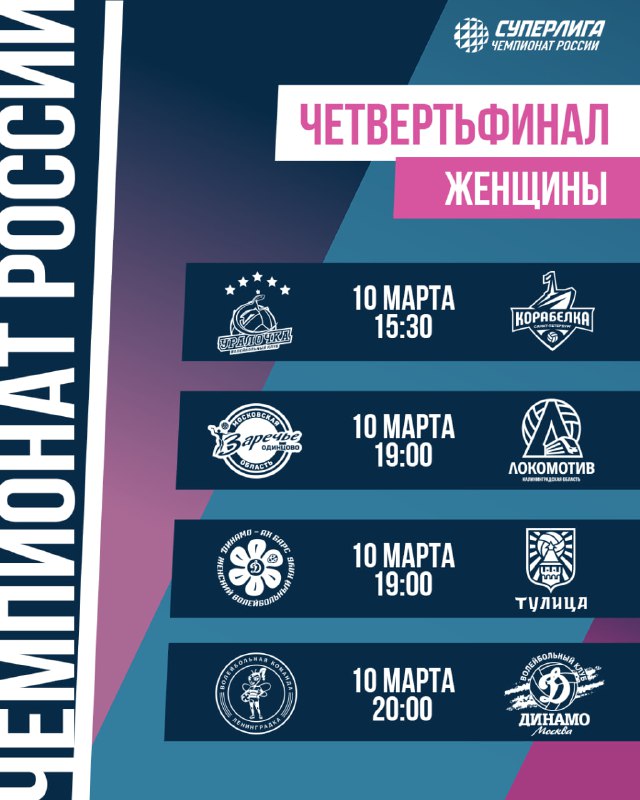 Даты и время начала матчей четвертьфинальной стадии женской Суперлиги 📆 🟣Время начала игр - московское 🟣В случае необходимости третьи матчи серий пройдут 16 и 17 марта. О времени их начала будет