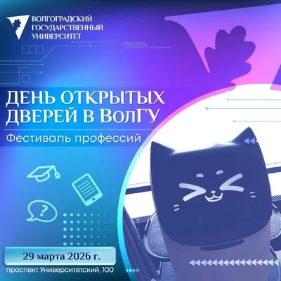 ⭐️ День открытых дверей и Фестиваль профессий в ВолГУ 🗓 29 марта, воскресенье 📊 В 10:00 — начало работы интерактивных площадок и консультаций В 11:00 — встречи с директорами институтов В 09:30