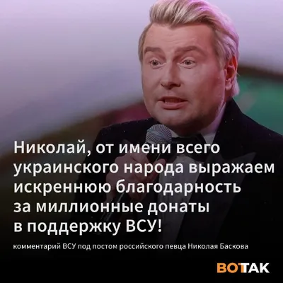 Минобороны Украины публично поблагодарило российского певца Николая Баскова за помощь ВСУ История началась с того, что музыкант, открыто поддерживающий войну России против Украины, поинтересовался у