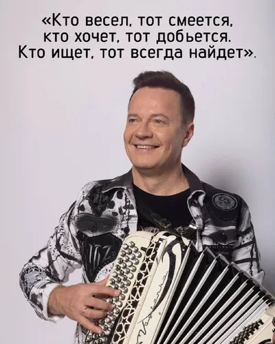 У меня есть очень простой девиз по жизни, который помогает двигаться вперед. Он родом ещё из советского времени, из замечательного фильма «Весёлые ребята». Там звучит песня «Кто весел, тот смеется»,