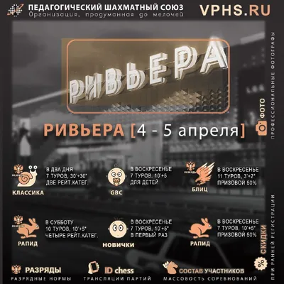 📣4 - 5 АПРЕЛЯ ПШС приглашает Вас на шахматные турнир РИВЬЕРА!📣 📍Место проведения: ТРЦ Ривьера (Автозаводская ул., 18, Москва). ⭐️ТУРНИРЫ 4 АПРЕЛЯ (суббота) •Классика А - 7 туров, 30’+30″. Рейтинг