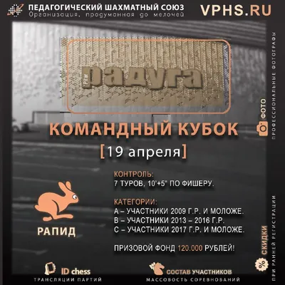 📣Командный кубок по быстрым шахматам среди мальчиков и девочек до 9 и до 13 лет, юношей и девушек до 17 лет состоится 19 апреля (воскресенье) в ТРК Питер Радуга.📣 Гарантированный призовой фонд турн