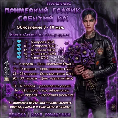 🌸 График событий и ивентов в Клубе Романтики. Ивенты "День Шоппинга" и "День Чаепития" могут поменяться местами. 🌕 изменения будут вноситься в зависимости от обстоятельств и событий в официальном