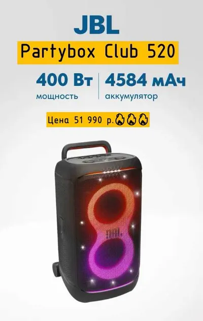 📣 Новые колонки JBL Party Box 520 всего за 52 990 р. 🔥🔥🔥 🔹Характеристики: - Мощность: 400 Вт (RMS) - До 15 часов автономной работы - Степень водонепроницаемости: IPX4 - Bluetooth 5.4 - Дин