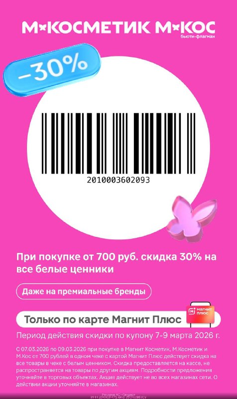 🩷КУПОН В МАГНИТ КОСМЕТИК 📢 ТОЛЬКО ПО 9 МАРТА Покажите купон на кассе, вместе с картой лояльности Магнит Плюс и получи скидку 30% 🤩 Акция действует НА ВСЕ ТОВАРЫ В ЧЕКЕ по белым ценникам, при общ
