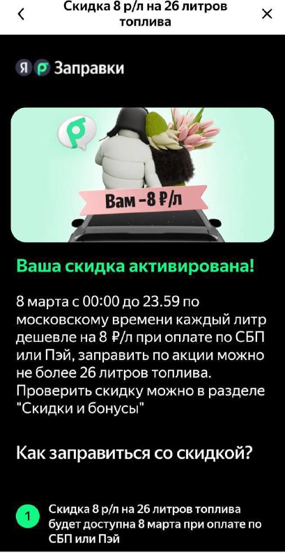 Едем все сегодня заправлять машину 🚗 😁 Яндекс заправки 8 марта скидка на 26 литров, по 8р с литра Если у Вас нет карты ПЭЙ - откройте БЕСПЛАТНО электронную онлайн https://bank.yandex.ru/invite?ref
