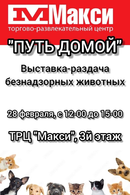 ❤️В Смоленске состоится выставка-раздача бездомных животных «Путь домой» 28 февраля, с 12:00 до 15:00, в ТРЦ «Макси» (3-й этаж) пройдёт выставка-раздача «Путь домой». Здесь можно найти кошек и котов