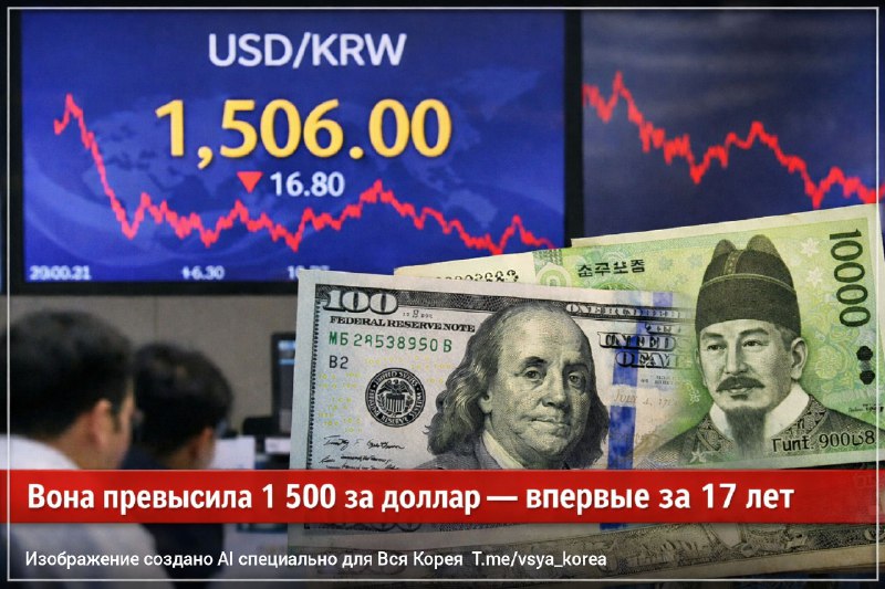 Вона впервые за 17 лет преодолела отметку курса 1 500 за доллар 4.03.2026 - Сеул $1=₩1480,5 Южнокорейская вона резко ослабла и впервые за 17 лет перешагнула за психологическую отметку 1 500 вон за