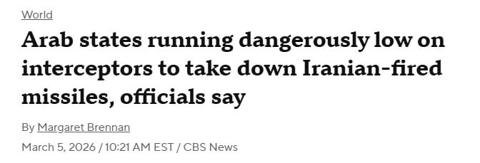 ⚡️Страны Персидского залива испытывают острую нехватку ракет-перехватчиков для уничтожения иранских ракет, — CBS News. Правительства стран региона обратились к США с просьбой ускорить поставки, и им