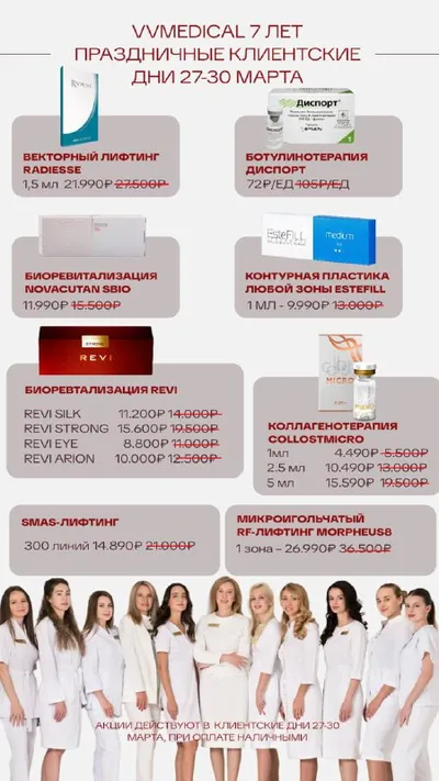 🎉 Нам 7 лет — празднуем вместе с вами! С 27 по 30 марта в VVMEDICAL проходят праздничные клиентские дни — это лучшие процедуры по специальным ценам ✨ Главные предложения: — Векторный лифтинг Radies