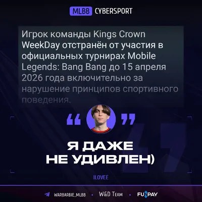 ❌ Игрок команды 💥 Kings Crown — ⚔️ WeekDay отстранён от участия в официальных турнирах MLBB до 15 апреля 2026 года включительно за нарушение принципов спортивного поведения. Причина бана — некоррект