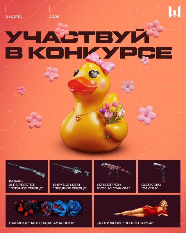 Участвуй в конкурсе, приуроченном к 8 марта 🌷 Призы: 1. Fabarm XLR5 Prestige "Ледяное сердце" 2. CheyTac M200 "Ледяное сердце" 3. CZ Scorpion Evo3 A1 "Сакура" 4. Glock 18C "Сакура" 5. Достижение "На