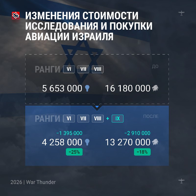 🔼Изменения стоимости исследования и покупки авиации VI+ рангов Вместе с добавлением нового IX ранга авиации и связанными с этим перестановками, о которых мы рассказывали ранее, снижены стоимости исс