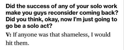 Q: Заставил ли вас, парни, успех какой-либо сольной работы задуматься над тем, стоит ли возвращаться? Думали ли вы, окей, теперь я просто буду сольным артистом? Тэхен: Я бы стукнул того, кому бы хват