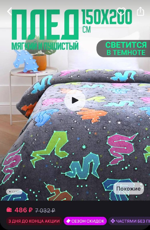 Плед светящийся 150х200 детский 🛒https://www.wildberries.ru/catalog/293921528/detail.aspx?size=448064533