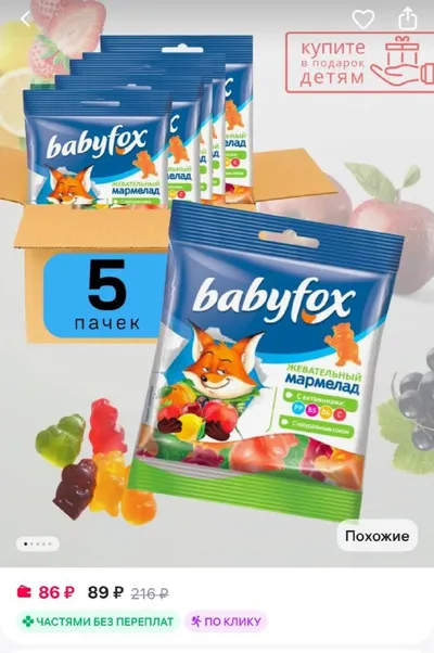 Babyfox Мармелад жевательный детский 5 шт по 30 г https://www.wildberries.ru/catalog/549223615/detail.aspx?size=756042370