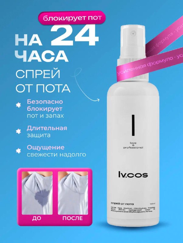 🔥 Блокирует пот на 24 часа! 🔥 Если устала переживать из-за мокрых пятен и запаха — это твое спасение 💙 💦 Спрей от пота Lv.cos Premium ✔️ безопасно блокирует пот и запах ✔️ длительная защита до 24