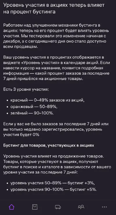 ⚡️ Уровень участия в акциях на WB теперь влияет на процент бустинга. 3 уровня участия: -красный - 0-49 % заказов из акций, -оранжевый - 50-89% -зеленый - 90-100%.