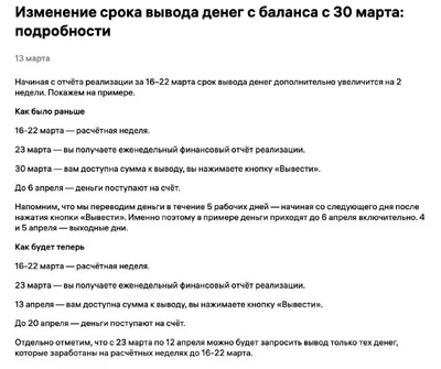 ⚡️ На WB изменится срок вывода денег с баланса с 30 марта. Как будет теперь? -16-22 марта - расчетная неделя. -22 марта - Вы получаете еженедельный отчет реализации. -13 апреля будет доступна су
