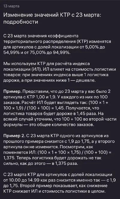 ⚡️ С 23 марта изменяются значения коэффициента территориального распределения (КТР) для артикулов с долей локализации 5–55% и 75–95%. -КТР используется для расчёта индекса локализации (ИЛ), который