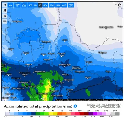❄️Прогноз накопления количества осадков с воскресенья, 1 марта, по утро четверга, 5 марта по версии моделей ICON (IC на рис.), ECMWF (Рединг) и AIFS (нейросетевой ECMWF). Осадки связаны с прохождением
