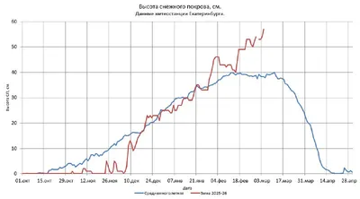 🔻Сравнение высоты снежного покрова (в сантиметрах) на метеостанции Екатеринбурга со средним многолетним значением (период осреднения 2008-2025 гг).