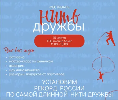 💕В Москве установят рекорд России: создадут самую длинную «Нить дружбы» 14 марта 📌Подробнее ЗДЕСЬ На фестивале «Нити дружбы» участники смогут восстановить контакт с давним другом: написать сообще