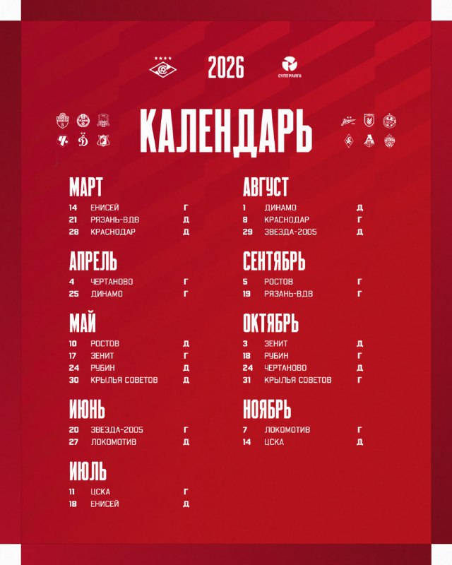 ⚡️ Официально: календарь ЖФК «Спартак» на сезон Суперлиги-2026 Первый тур по традиции проведём в Красноярске 14 марта, а в Сокольниках увидимся с вами уже 21-го числа ❤️🤍