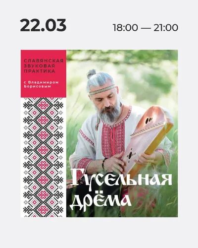 Славянская звуковая практика ГУСЕЛЬНАЯ ДРЁМА с Владимиром Борисовым 🔥22 марта в 18:00 в Белых Облаках Встречаем астрономическую весну под гусельную музыку! Гусельная Дрёма — это и концерт, и зву