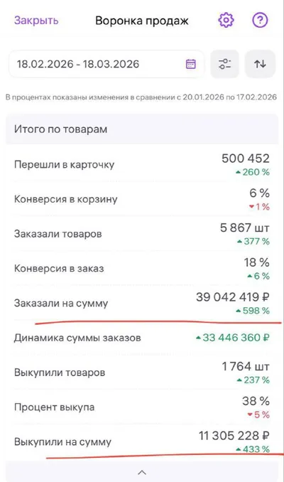 И потом вы тоже сможете получить такие результаты🔥🔥40 млн за месяц в заказах Продолжаем делать клиенту с ежемесячного ведения увеличивать цифры На данный момент у нас 40 млн в заказах, 12 выкупах,