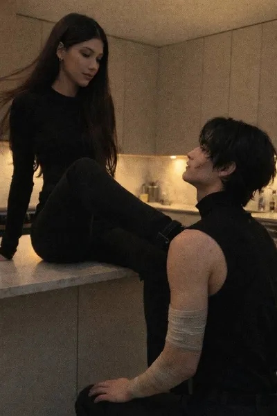 Amateur iPhone candid snapshot of a stylish modern kitchen interior. A beautiful tall woman in a short black dress sits confidently on a kitchen table. One of her long legs rests casually on the shoul