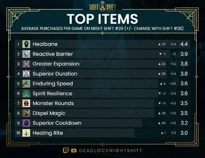 ⚡️ЛУЧШИЕ ПРЕДМЕТЫ ПРО-СЦЕНЫ! Организаторы Deadlock Night Shift поделились своим топом: в тройку лучших вошли Healbane, Reactive Barrier и Greater Expansion. 🔥 — годно