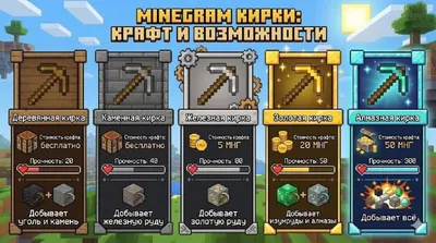🌟🌟Всё про кирки в MINEGRAM💫💫 ⛏️⛏️Полезная инфографика, которая показывает всё, что нужно знать о кирках в игре. Если хотите быстрее добывать ресурсы и прокачиваться, обязательно изучите. ⛏️ 🎮 И