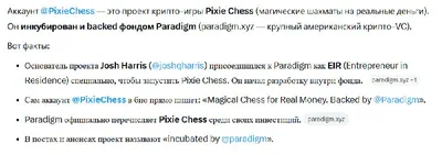 апдей по шахматам PixieChess ( это те где сео вроде как в парадигме ) Запуск 2го апреля, по поводу связи с парадигмом мнение грока на скриншоте. always #dyor