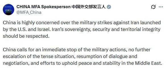 Китай призвал к немедленному прекращению боевых действий, недопущению дальнейшей эскалации, возобновлению диалога и переговоров, а также к усилиям по сохранению мира и стабильности на Ближнем Востоке