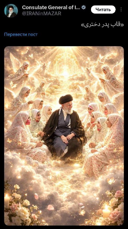 В официальном акаунте аятоллы Хаменеи опубликовали его картинку в раю с гуриями, которых изобразили в виде маленьких девочек. Видимо, после смерти он попал на остров Эпштейна
