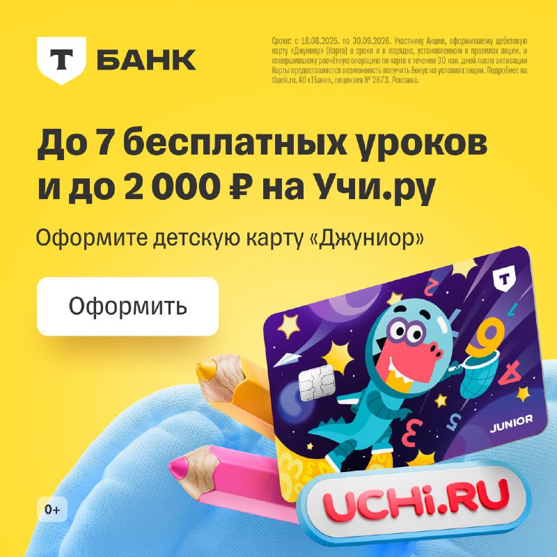 💳 Т-Банк: до 2000₽ на курсы Учи.ру и 7 уроков в подарок при оформлении карты Junior 1. Переходим на страницу акции и оформляем детскую карту «Джуниор» в эксклюзивном дизайне. 2. Совершаем любую поку