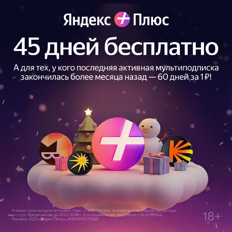 ✨ Яндекс Плюс: до 60 дней подписки за 1₽ или бесплатно — доступ к кино, музыке и книгам 1. Переходим на страницу одного из сервисов по ссылкам ниже. 2. Авторизуемся и вводим эксклюзивный промокод для