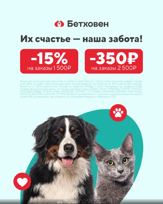 🐾 Бетховен: скидки до 15% на товары для животных — промокоды на любой заказ 1. Переходим на страницу акции и выбираем товары для своих питомцев. 2. В корзине при оформлении заказа вводим подходящий