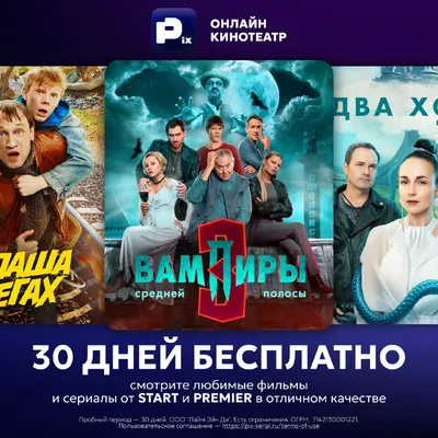 Онлайн-кинотеатр PIX — 30 дней по промокоду бесплатно • Тысячи фильмов и сериалов в одном приложении • Популярные фильмы и сериалы от START и PREMIER — два онлайн-кинотеатра по цене одного • Смотрите
